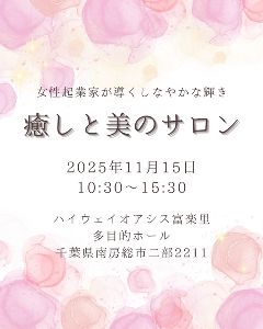 癒しと美のサロン~女性起業家が導くしなやかな輝き~。忙しい日々の中で、つい後回しにしてしまう「自分のための時間」そんな頑張り屋な大人の女性たちに贈る、心と身体が潤う特別なご褒美の1日。各分野で活躍する5人の女性起業家が集い、あなたの心と身体を優しく整え、内側から美しさを磨くお手伝い。会場で五感を満たすアロマの香りに癒されながら、心ゆくまで自分と向き合う時間を楽しもう。