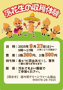 道の駅グリーンファーム館山では、「落花生の収穫体験」を開催!収穫体験なので、汚れても良い服装で来場を。千葉の名産品である、落花生の収穫体験に参加してみよう!