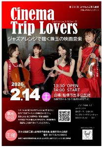 誰もが知る名作映画の音楽を、オリジナルアレンジで鮮やかに再構築。懐かしくも新しい、クラシックでもポップでもない。映画音楽を「ライブミュージック」でお届けする新しいスタイルで贈るコンサート。出演:Cinema Trip Lovers。予定曲:ムーンリバー、愛のテーマ、ひまわり ほか。1月16日(金)10時~22日(木)までHPのURLから申込み受付。入場無料(定員300名)。応募者多数の場合は抽選。