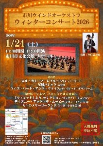 市川ウインドオーケストラ ウィンターコンサート2026。第一部吹奏楽オリジナルステージ、第二部シネマI.W.0~音で観る映画〜。プログラムは、エル・カミーノ・レアル/アルフレッド・リード、星屑パレット/芳賀傑、ウィズ・ハート・アンド・ヴォイス/デイヴィッド・ギリングハム。指揮は井口 信之輔。
