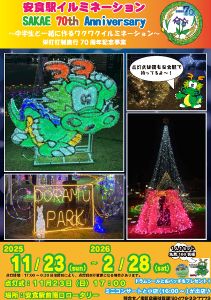 安食駅に賑わいを創り、きれいなイルミネーションが駅を彩る。今年度は記念ロゴマークを作成した、栄中学校の美術部とコラボレーションをしたアート作品を設置。家族や友だちと一緒に冬の時間を楽しみに行こう。
