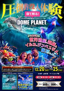 地球上の様々な自然・生き物・文化を360度映像で切り取り届けるドームプラネットを開催! 巨大なエアドームの中で360度の映像を見ることで、まるでその場にいるかのような体験ができる。今回は「イルカ・ジンベエザメと泳ぐ世界の海」と「流氷ダイビングとクリオネ」を交互に上映。クリスマスは世界遺産の知床と、イルカやジンベエザメを体感しよう!