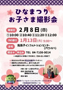 お内裏様やお雛様になって記念撮影しよう。衣装を貸出、着付けあり。カメラ・スマートフォン等の持参を。参加した子どもには手賀沼のうなきちさん缶バッジをプレゼント! 対象は、3~12歳の子ども(各回先着7組 計28組) 。保護者同伴。要事前申込。申込は、電話または直接来館を。