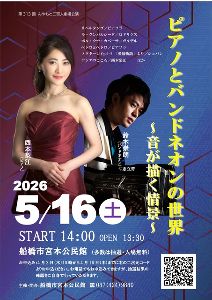船橋市宮本公民館にて、『みやもと三百人劇場「ピアノとバンドネオンの世界~音が描く情景~」』を開催! 出演:西本梨江(ピアノ)、鈴木崇朗(バンドネオン)。予定曲:リベルタンゴ、ラ・クンパルシータ、ペドロとペドロ ほか。申し込みはHPのリンクから(受付は4月2日10時から4月16日まで/申込多数のときは抽選)。