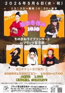 「千鳥の鬼レンチャン」で話題の坂本冬休みと、JUJUのものまねでおなじみのJOJOによるスペシャルステージ。本人と見間違える本格歌謡ショーから、しゃべりマネ、メドレー等で会場を盛り上げる。ラインナップは当日までのお楽しみ。プラッツ習志野でしか味わえない特別なステージ。客席におりて近くまで来ることも。写真撮影、SNS投稿OK!(※動画撮影は禁止)ぜひ行ってみよう。