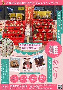 利根運河周辺の飲食店や施設、駅や大学など20会場で、段飾りやつるしびな、野菜雛や子どもたちの作品など、それぞれのひな飾りを展示し、スタンプラリーを開催。店舗でのひなメニュー提供や、2/28と3/1を中心に4会場でイベントも行われる。スタンプは購入で3ポイント、見学で1ポイントで、5ポイント集めて交流館に行くとクジが引け、たい焼きやソーセージ、スイーツセットの引換券など参加施設提供の商品が当たる!