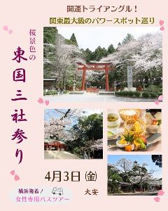 桜色に染まる「禊の旅」へ。大安吉日に巡る春の東国三社巡り2026年第二弾は、新年度のスタートにふさわしい 4月3日(金)「大安」 の吉日参拝。1年で最も神域が美しく輝く、桜シーズンの特別なひとときを過ごしてみてはいかが?1日で茨城・千葉に跨る関東最強のパワースポットトライアングルを巡る、大人の女性のための「ととのい」バスツアーだ。