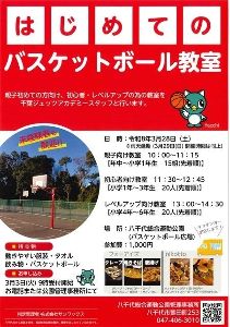 親子初めての人向け、初心者・レベルアップの為の教室を千葉ジェッツアカデミースタッフと行う。親子向け教室10:00~11:15。初心者向け教室11:30~12:45。レベルアップ向け教室 13:00~14:30。持ち物:動きやすい服装・タオル飲み物・バスケットボール。キッチンカーも出店する。