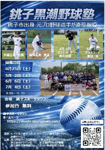 野球を始めたい小中学生、初心者で上手くなりたい小中学生に、銚子市出身のプロで大活躍した銚子商業のエースで4番、甲子園優勝、その後ロッテオリオンズで112勝した木樽正明さんと甲子園で優勝し巨人軍で大活躍、二度の首位打者を獲得した篠塚和典さんが直接指導してくれる。小学生から中学生まで定員40名。雨天の場合は体育館で行う。その際は上履きが必要。今回のゲストコーチは元ロッテマリーンズの澤井良輔さん。