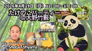 今年も専門家を迎え、植物採集を楽しむイベントを開催する。BBQ肉料理も用意! 名物のたけのこの大地焼きをはじめ、さまざまな筍料理も楽しめる。 ソフトドリンク、野草茶飲み放題(振る舞い酒あり、持ち込み歓迎)※ 未成年および運転手のへの酒類の提供は固くお断り。雨天決行 春は天候が変わりやすいため、晴天時も雨具の持参をおすすめ。持ち物 採集用の袋、長靴、軍手、虫除け、移植ごて(既に持っている人)