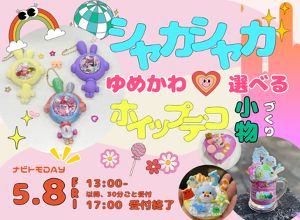 小さな子供から大人まで、誰もが夢中になれる可愛さ満点の制作体験。選べるラインナップは、可愛いケースの中に好きなビーズやパールを詰め込む「シャカシャカ」と本物の生クリームのような「ホイップ」やソースを使って、小物をデコレーションする「ホイップデコ」小物作り。是非、世界にひとつだけ、あなただけの「ゆめかわ小物」を作ってみては?