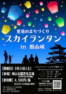 「里見ゆかりの地」でLEDランタンを一斉に打ち上げる。 館山の夜空に願いをのせ幻想的な雰囲気を一緒に楽しもう。ライトアップした館山城を見上げながらランタンを打ち上げるイベント。たくさんのランタンを一斉に浮かべることで、夜空に灯りを灯し、幻想的な空間を作り上げる。プロカメラマンによる写真撮影付き。打上げエリアには4名迄入場可能。