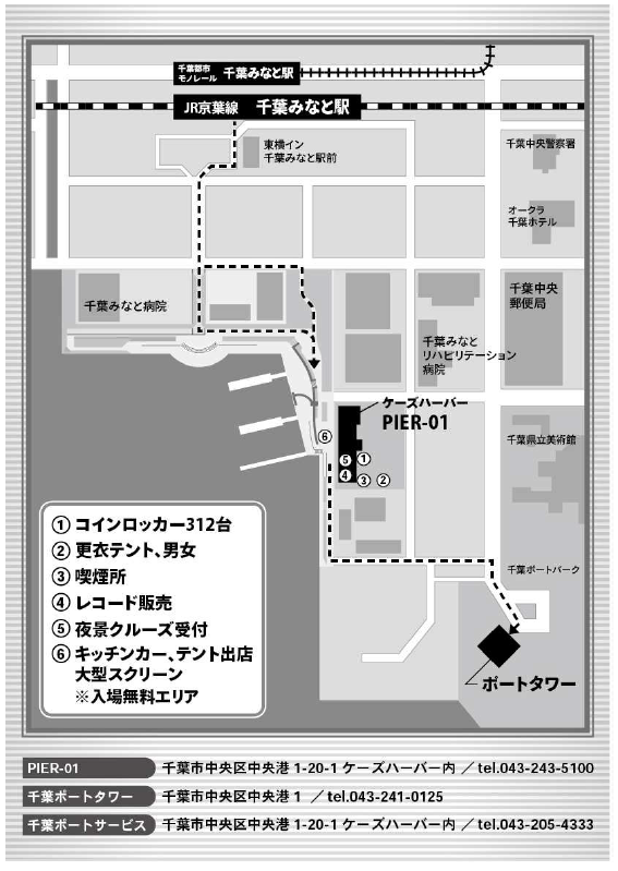 会場 受付はPIER-01のフロントにて。①ケーズハーバー(PIER-01) ②千葉ポートタワー ③千葉港遊覧船 あるめりあ ④さんばしひろば