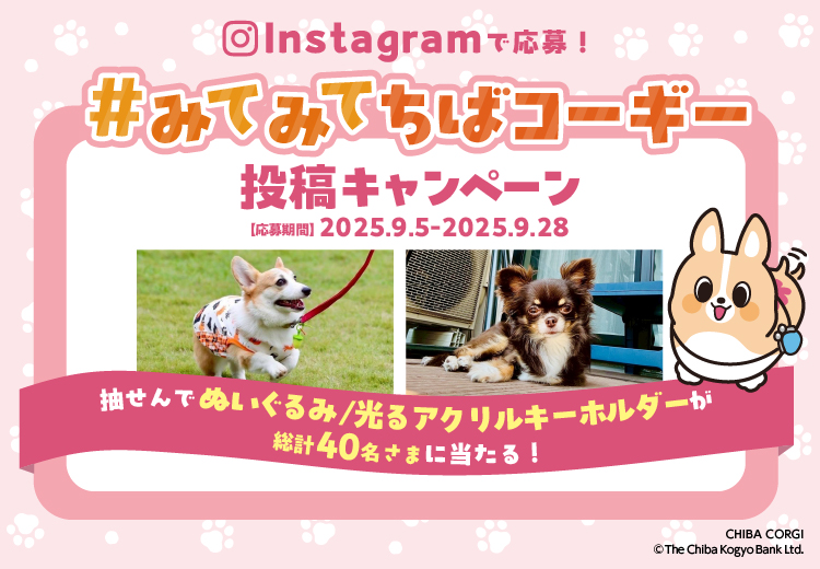 応募方法 | 1.当行Instagramアカウント【@chibakogin_official】をフォロー https://www.instagram.com/chibakogin_official/ 2.以下のいずれかのテーマに沿った写真・動画を投稿 ①千葉県内のお出かけ先で撮影した「愛犬のとっておきショット」 ②残暑も吹き飛ぶ!「愛犬の癒しショット」 投稿文の中に「①」または「②」と記載し、投稿テーマに沿った写真・動画を「#みてみてちばコーギー」をつけて投稿 投稿文例:「①千葉県の○○で撮影したお気に入りショット」「②おうちでくつろぐ癒しの瞬間」 |