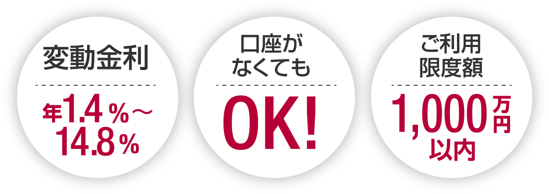 | お使いみち | 自由(ただし、事業性資金、投機性資金、旧債務返済金は除きます。) | ||||||||||||||||||||||||||