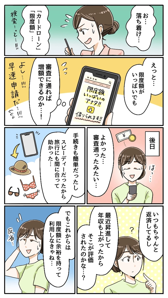 カードローンの増額や新規申込みに比べると手続きが簡単で、急な出費にも対応しやすいのが特徴です。