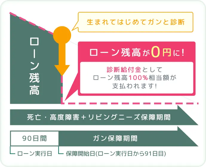 診断給付⾦(=残⾼相当額)が⽀払われ、ローン残⾼が0円になります。