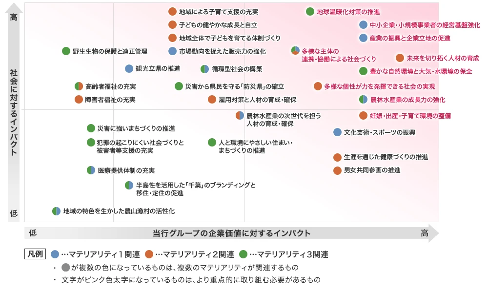 千葉県総合計画で記載された重点取組事項をもとに、当行グループにて社会および当行グループのインパクト評定しました。右上ほどインパクトが大きいと判断し、マテリアリティ設定要素としたうえで、サステナビリティ推進委員会を中心に、社外役員との意見交換等、積極的な議論を重ね、経営会議および取締役会での承認を経ております。