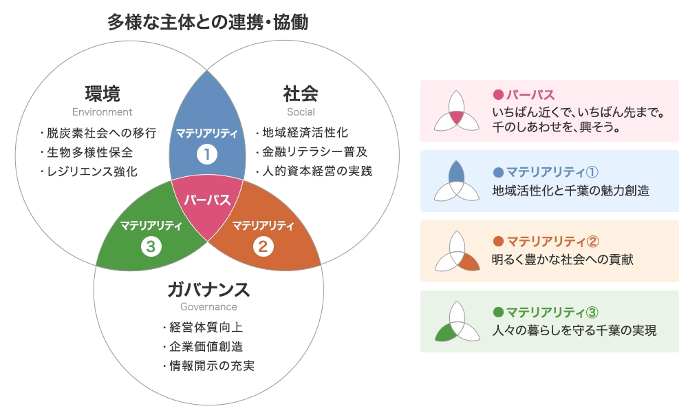 地域金融機関として千葉県の持続可能性を実現することこそが、当行グループおよびステークホルダーの成長と発展につながる機会であると考え、次世代が誇れるような光り輝く千葉へさらに飛躍するため、千葉県の諸課題の中から当行が持つ強みを発揮することで解決に寄与できる項目を優先課題として抽出しております。2025年度より開始した新たな中期経営計画に併せて重点項目(マテリアリティ)の見直しを行い、下記の通り3つのマテリアリティへ集約しております。
