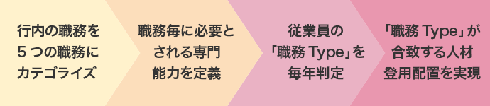 具体的には、従業員一人ひとりの強みを重視するため、性格や行動特性、保有する専門能力等によって、毎年「職務Type」を判定し、個々に適したキャリア開発支援やスキル向上の機会を提供いたします。また、各職務毎に必要とされる専門能力と従業員個人の「職務Type」が合致する人材登用や配置を実現することで、モチベーションを向上させます。さらに、組織目標と個々の貢献を結びつけることで、従業員の帰属意識を醸成し、エンゲージメントを高めてまいります。